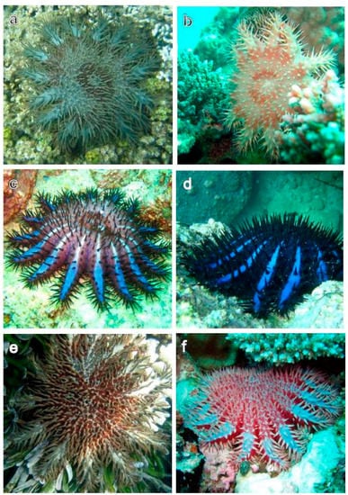 - Pratchett, M.S.; Caballes, C.F.; Rivera-Posada, J.A.; Sweatman, P.A. Limits to understanding and managing outbreaks of crown-of-thorns starfish (Acanthaster spp.). Oceanogr. Mar. Biol. Ann. Rev. 2014, 52, 133–200. [Google Scholar]