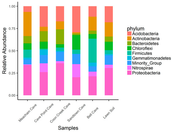 The total number of merged reads aligned successfully to each sample varied among the six samples. The sample from Bell Cave had the highest number of aligned reads (990,292), while Sandtown had the lowest number (193,424) (Table 1). Given the rarity of Archaea in our data (0.01–0.2% of reads), we decided to omit Archaea and focus on the bacterial communities. A total of 49 bacterial phyla were identified with seven major phyla (by average relative abundance across samples) represented among the five studied caves and lawn soil sample: Proteobacteria (average: 27.7%; range: 19.77–35.68%), Acidobacteria (17.3%; 6.33–28.55%), Actinobacteria (12.2%; 1.34–26.85%), Firmicutes (8.2%; 1.22–26.47%), Chloroflexi (8.1%; 3.64–15.88%), Bacteroidetes (8%; 1.78–16.62%), and Nitrospirae (6%, 0.9–14.4%). Figure 1 shows the relative abundance of the top eight bacterial phyla in all samples. All other phyla were merged together into one group called Minority group as indicated in the legend.