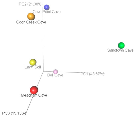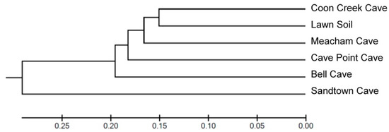 All cave exploration was done in accordance with National Speleological Society guidelines [24]. Cave soil samples were collected from the region of 10–50 m from the entrance in 15 mL sterile centrifuge tubes. Samples were transported back to the lab at room temperature and stored at 4 °C prior to DNA extraction. We also extracted total metagenomic DNA from a lawn soil sample on the Lyon College campus for the comparison of bacterial composition and abundance. Previous studies have shown distinct differences between subterranean and surface environments (e.g., forests and agricultural fields) [25,26]. Therefore, we expected the lawn soil sample to show greater dissimilarity with other cave samples and function as an outgroup.