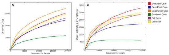 Rarefaction and Chao1 estimate of taxonomical richness for five Ozark Caves and a control sample (lawn soil). (A) rarefaction curves indicate the number of detected OTUs as more sequences are considered per sample; (B) Chao1 estimate indicates that Meacham Cave had the highest diversity, whereas Sandtown Cave had the lowest diversity.