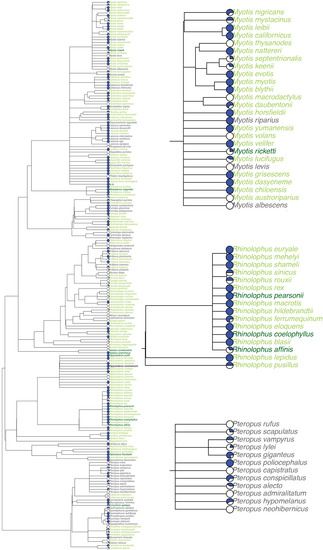 - Simmons, N.B. Order Chiroptera. In Mammal Species of the World; Wilson, D.E., Reeder, D.M., Eds.; The John Hopkins Press: Baltimore, MD, USA, 2005; pp. 312–529. [Google Scholar]