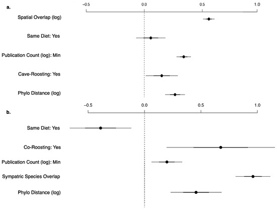 Coefficient plot for the best viral sharing generalized linear models for shared stringent viruses (Y/N) between (a) all bat species-pairs (n = 7864) and (b) co-roosting bat species-pairs (n = 1378). Each model includes publication count, phylogenetic distance, shared roosting behavior, and shared dietary niche. Spatial overlap is the best predictor for all species, while number of sympatric viral hosts performed better in the co-roosting species subset. All variables are significant.
