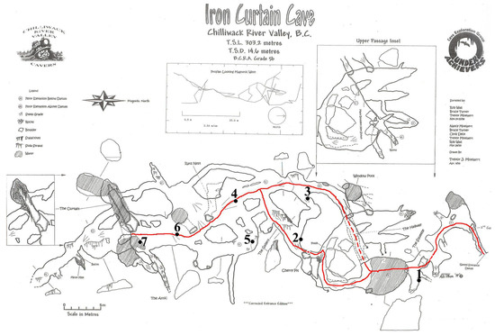 Map of Iron Curtain Cave in Chilliwack B.C. The numerals denote the locations of sampling points where media plates were left for nine months. #1 = Connection Room; near Squeeze dig around and Looking Pool, #2 = Upper section of The Gallery, near the climb to the Breakdown room, #3 = Entrance to side passage across from the Chocolate waterfall, #4 = Sitting area just beyond Lollipop Passage, #5 = Octopus Room, #6 = Mid passage to the Curtain, just past the Wishing Well, #7 = Chandelier Pit just below The Attic.