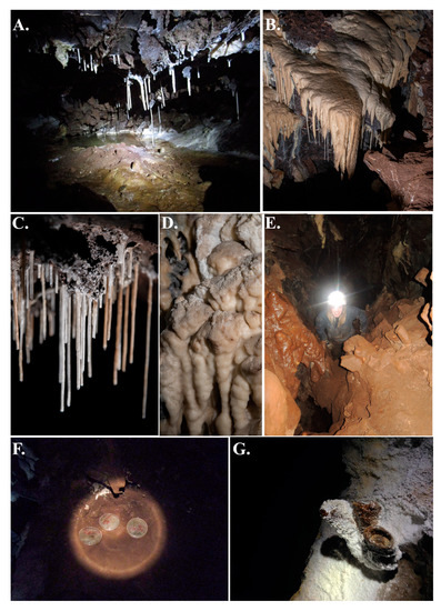 Iron Curtain Cave, Chilliwack, British Columbia, Canada. (A) Site #4: The Octopus Room; (B,C) Site #7: with two types of speleothem common to the cave; soda straws and bacon; (D) The Curtain made of calcium carbonate; (E) Soil sediment containing iron as well as some more geographical features unique to the cave; (F) The media plates are exposed for nine months in the cave; (G) The popcorn structures.