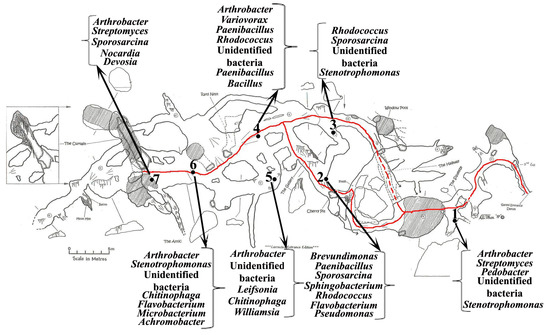 Seven different sampling points (1–7) were chosen arbitrarily in the cave in order to compare the microbiome diversities (Figure 1). At each site, the swabs of wall samples were inoculated on to the R2A (Teknova, Hollister, CA, USA) and Difco™ Actinomycete Isolation agar media (Thermo Fisher Scientific Inc., Waltham, MA, USA). These plates were then left with lids closed at these seven different locations in the cave (Figure 1) to mimic the original incubation cave temperature. The incubation temperature during these nine months ranged from 4–8 °C. After nine months from the day of inoculation, these plates were collected from the cave. Plates were transported to the laboratory aseptically for bacterial isolation.
