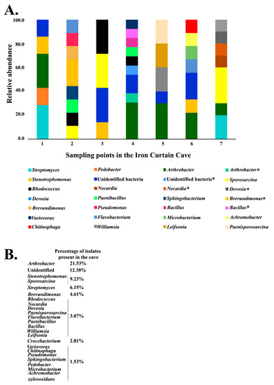 (A) Taxonomical distribution of the bacterial isolates from Iron Curtain Cave by sampling sites. The vertical rectangular stalked columns represent the relative bacterial abundance. The asterisk (*) denotes the percentage of the bacteria that are not assigned with the gene accession numbers. (B) Percentage of total isolates from all sampling sites.