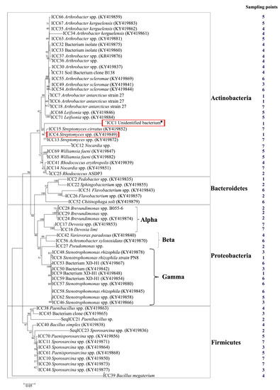 The evolutionary relatedness of these bacterial isolates depicted in the dendrogram demonstrated Actinobacteria (44.61%) were the major phylum, followed by Proteobacteria (27.69%) and Firmicutes (20%), and the least common phylum were Bacteroidetes (7.69%). Proteobacteria and Firmicutes were identified as 27.69% and 20% respectively. Among the Proteobacteria, 55.55% were recognized in the class of Gammaproteobacteria, 27.77% as Alphaproteobacteria and 16.66% as Betaproteobacteria. The unknown bacterial isolates fall in clades of Arthrobacter spp. (Phylum Actinobacteria), Stenotrophomonas spp. (Phylum: Gammaproteobacteria) and Paenibacillus spp. (Phylum Firmicutes) (Figure 5). Notably, both the antimicrobial bacterial isolates (ICC1 and ICC4) may be identified under the phylum Actinobacteria; however, with ICC1’s sequence having low similarity (73%) to the Streptomyces nojiriensis (Table S2), it is hence referred to as an unidentified bacterium.