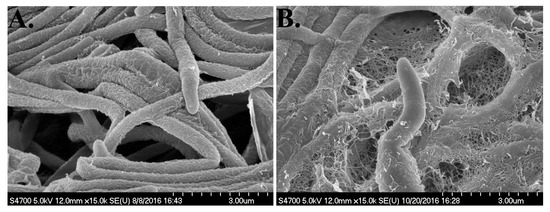 The antimicrobial activity screening of the identified bacterial isolates (ICC1 and ICC4) detected two homologues of Streptomyces spp. that possess antagonistic properties against regular and MDR bacterial strains of E. coli. Although the ICC1 has exhibited a very low homology of 73% to Streptomyces spp., SEM images of the both the isolates displayed Actinobacterial-like structures (Figure 6). Both SEM images showed typical aerial hyphae that are densely packed without spores being observed. ICC1 showed interwoven filaments with an irregular rugose surface, while ICC4’s hyphae was observed with a rather smoother surface. The antimicrobial activities of these bacteria could be correlated to a previous study on Turkish Karstic caves, where Streptomyces spp. strain number 1492 (Actinomycetes bacteria) displayed antagonism against S. aureus (MRSA), vancomycin resistant Enterobacter faecium (VRE), and Acinetobacter baumannii [49]. A similar study from the Helmcken Cave in Wells Gray Provincial Park, BC (volcanic caves) identified 400 bacterial isolates, where a preliminary screening of these bacteria for antimicrobial activities identified 26.50% against K. pneumoniae, 10.25% showed inhibitory activity against M. luteus, 9.25% against M. smegmatis, 7.5% against C. albicans, 6.25% P. aeruginosa, 2.25% against A. baumannii, 2% against S. aureus, 1.75% against E. coli and 1% against ESBL E. coli [5]. In alignment to our findings, a recent review article [1] indicated that cave microbiomes has recently been considered as potential resources for novel drugs and antibiotics. Notably, both ICC1 and ICC4 isolates were from sampling point one in the cave. We intended to use quantitative analysis and comparison of the cultured bacterial diversity among the seven sites to see whether there is any connection between site(s), its microbial habitants, and antimicrobial activity potential. However, we think more detailed studies need to be conducted before we can conclude on such relationships.