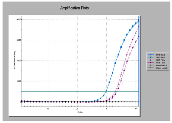 Real Time polymerase chain reaction (PCR) amplification profiles for a medieval period case of lepromatous leprosy (Sk45) obtained using the RLEP PCR method with product reported with a specific probe. Extracts were tested in duplicate. Product is seen amplified from the hand (blue traces) and tibia (red traces). Black traces represent non-template controls (water blanks).