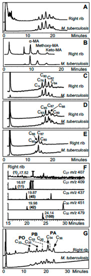 Lipid biomarker profiles for right rib of woman from Atlit-Yam [28,66]. (A) Total mycolates, reverse phase high performance liquid chromatography (HPLC); (B) Collected total mycolates (MAs), normal phase; (C) Collected α-mycolates, reverse phase; (D) Collected methoxymycolates, reverse phase; (E) Collected ketomycolates, reverse phase; (F) Gas chromatography mass spectroscopy (GC-MS) of mycolipenate (C27 m/z 407) and mycocerosates (C27, C29, C30, C32) characteristic of TB; (G) Reverse phase HPLC of phthiocerol family—PA phthiocerol A, PB phthiocerol B, PO phthiodiolone. Comments: Excellent MTB MA and mycocerosate profiles, with weak mycolipenate; good profiles of phthiocerol family. Verdict: Certain MTB.