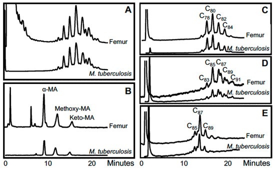 Lipid biomarker profiles for femur of Granville mummy [55]. (A) Total mycolates, reverse phase HPLC; (B) Collected total mycolates (MAs), normal phase; (C) Collected α-mycolates, reverse phase; (D) Collected methoxymycolates, reverse phase; (E) Collected ketomycolates, reverse phase. Comments: Excellent MTB MA profiles. Verdict: Clear MTB.
