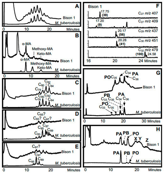 Lipid biomarker profiles for bison metacarpal from Natural Trap Cave with lesions [29,66]. (A) Total mycolates, reverse phase HPLC; (B) Collected total mycolates, normal phase; (C) Collected α-mycolates, reverse phase; (D) Collected methoxymycolates, reverse phase; (E) Collected ketomycolates, reverse phase; (F) GC-MS of mycolipenate (C27 m/z 407) and mycocerosates (C27, C29, C30, C32) characteristic of TB; (G) Reverse phase HPLC of phthiocerol family—PA phthiocerol A, PB phthiocerol B, PO phthiodiolone; (H) Normal phase HPLC of collected phthiocerol fraction, X–Z are unidentified. Comments: Inconclusive degraded MA profiles, but strong mycolipenate and mycocerosates; positive profiles of phthiocerol family and potentially diagnostic unknowns (X–Z). Verdict: Mycolipenate decisively confirms MTB complex.