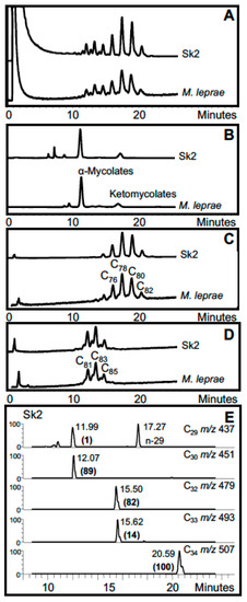 Lipid biomarker profiles for Winchester leprosy specimen Sk2 [38]. (A) Total mycolates, reverse phase HPLC; (B) Collected total mycolates (MAs), normal phase; (C) Collected α-mycolates, reverse phase; (D) Collected ketomycolates, reverse phase; (E) GC-MS of mycocerosates (C29, C30, C32, C33, C34) characteristic of leprosy. Comments: Excellent leprosy MA and mycocerosate profiles. Verdict: Certain leprosy.