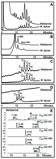 Lipid biomarker profiles for metatarsal from Great Chesterford leprosy specimen GC 96 [40]. (A) Total mycolates, reverse phase HPLC; (B) Collected total mycolates (MAs), normal phase; (C) Collected α-mycolates, reverse phase; (D) Collected ketomycolates, reverse phase; (E) GC-MS of mycocerosates (C29, C30, C32, C33, C34) characteristic of leprosy. Comments: Inconclusive degraded MA profile has α-mycolates four carbons shorter than M. leprae, but good mycocerosate profile has M. leprae-specific C34 mycocerosate. Verdict: Most likely leprosy and not MTB.