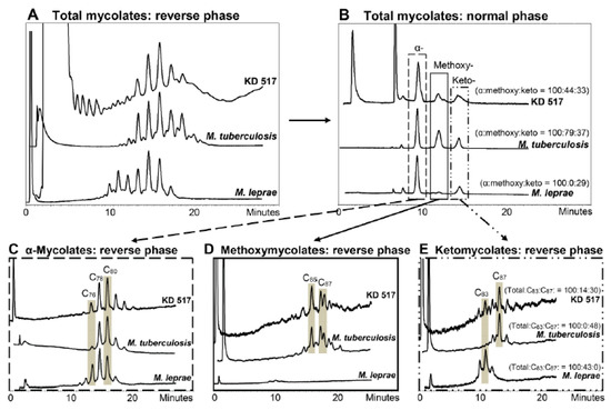 Mycolic acid profiles from Kiskundorozsma, Hungary, KD 517 [13]. (A) Total mycolates, reverse phase HPLC. (B) Collected total mycolates (MAs), normal phase; the normalized ratios of the α-mycolates, methoxymycolates and ketomycolates, respectively, are in brackets. (C–E) Reverse phase HPLC of collected α-mycolate, methoxymycolate and ketomycolate fractions, respectively; the normalized ratios of ketomycolate C83 and C87 components are shown in brackets in (E). Comments: Good total MA profile (A) and α-mycolates (C) resemble MTB, but ketomycolates (E) have a C83 component typical of M. leprae. Verdict: Major MTB with inconclusive indication of leprosy.