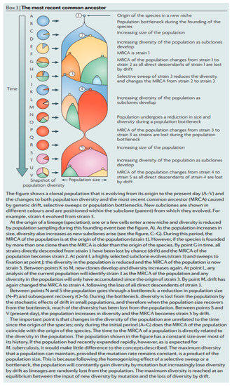 - “Every species has a most recent common ancestor (MRCA) that is the coalescence of all extant lineages. The MRCA of M. tuberculosis is not necessarily the first strain of M. tuberculosis to infect humans, and is no more than the coalescence of all extant lineages; it may have been one member of a large population of M. tuberculosis strains (Figure 10)”.