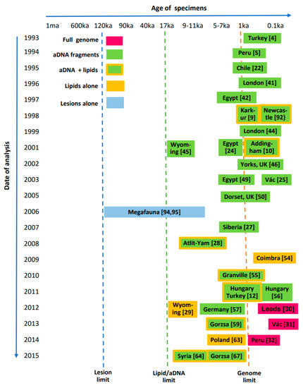 - Taylor, G.M.; Mays, S.A.; Huggett, J.F. Ancient DNA (aDNA) studies of man and microbes: General similarities, specific differences. Int. J. Osteoarchaeol. 2010, 20, 747–751. [Google Scholar] [CrossRef]