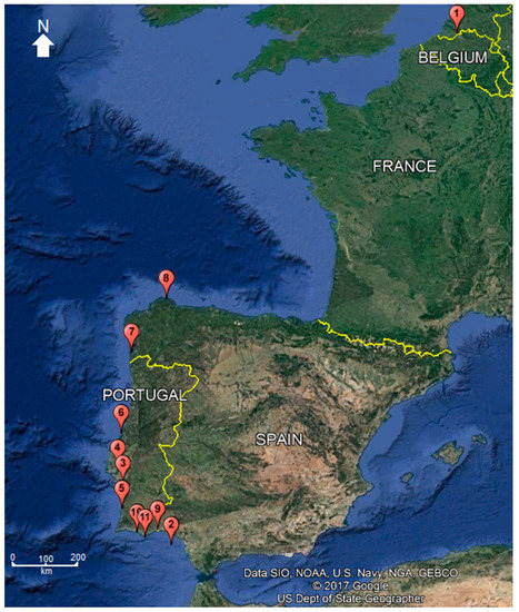 Locations where weakfish Cynoscion regalis (Bloch & Schneider, 1801) (Actinopterygii: Sciaenidae) have been collected in Europe. The numbered pins are ordered chronologically concerning first known reports of weakfish captures along Europe. Please notice that first reports do not necessarily coincide with the date of introduction. Legend: 1—Scheldt estuary, September 2009 [27]; 2—Gulf of Cádiz, 2011 [5]; 3—Sado estuary, the first written report was made in September 2014, but it was noticed in the area for “some” years before [5,28]; 4—Tagus estuary, 2013 or 2014 [29]; 5—Mira estuary, 2013 or 2014 [29]; 6—Praia da Vieira, October 2015 [6]; 7—Ría de Vigo, June 2016 [30]; 8—Ría do Barqueiro, June 2016 [30]; 9—Guadiana estuary, June 2016 [2]; 10—Praia do Barranco das Belharucas, July 2016 [2]; 11—Ria Formosa [31]. Map retrieved from Google Earth.