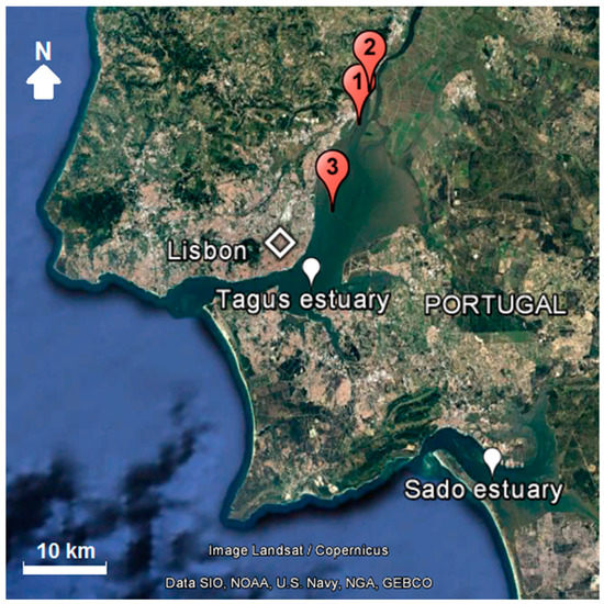 Locations where weakfish Cynoscion regalis (Bloch & Schneider, 1801) (Actinopterygii: Sciaenidae) were collected in the Tagus estuary—Alverca (3 May 2015). (1), Alhandra (16 September 2016); (2), Vasco da Gama bridge (12 November 2016); (3). Map retrieved from Google Earth.