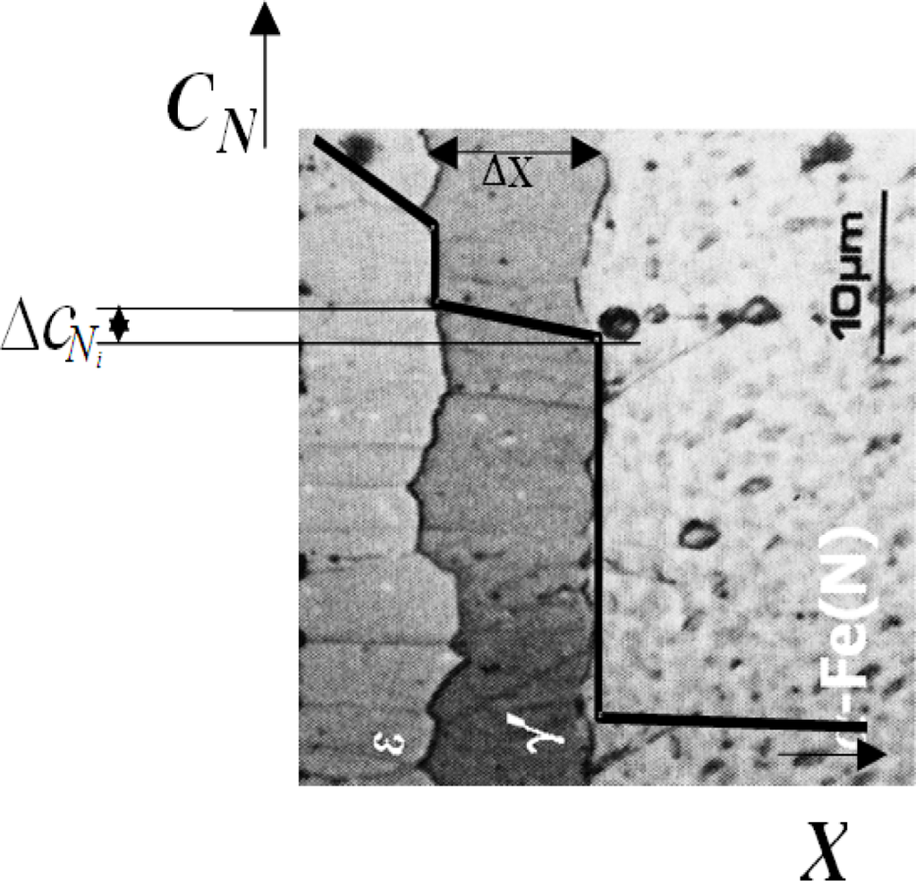 Experimental data concerning the growth of particular mono-phase zones in the nitrided layer (Figure 1) [29], as well as the growth of such zones in other diffusion systems, e.g., metal-metal [30], indicate the parabolic law of the growth of phase zones: