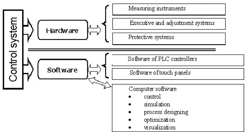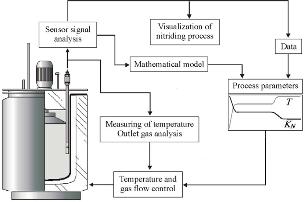 The constructed control system of the nitriding process [23] includes innovative hardware solutions and a process programming module (software) (Figure 4). The hardware, independently of the standard measuring systems of the process parameters: temperature and the composition of the nitriding atmosphere, includes the block of a process result sensor (magnetic sensor), which reacts directly in the process to the nucleation and growth of the nitrided layer. In the programming module, in compliance with the latest world trends concerning modern control systems [24–28], process models were integrated with the operating procedures. The process models which enable its simulations are of a particular importance: as a result, they provide the technologists with significant information concerning different variants of the realization of the process and the operating properties of the nitrided formed in such processes [26,27]. Consequently, operating procedures allow technologists to holistically design the nitriding process.