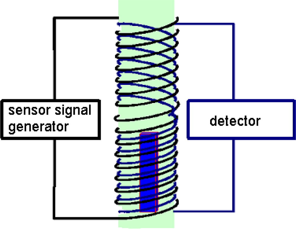 In the solution applied, the measuring section of the sensor was equipped with a coil with double winding. A high frequency alternate current flowing through the primary winding generates an electromagnetic field which penetrates the sample tested. As a consequence, the resultant field is formed in the coil area, which induces a voltage signal in the secondary winding of the coil. As a result of the testing examinations, the variant was selected with two push-pull connected sections of the secondary coil, while the sample tested is located in one of the sections: cf. Figure 11. Owing to this, a change of the voltage signal induced depends solely of the changing electromagnetic properties of the sample.