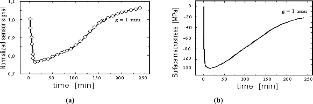 This condition having been met, in the process time corresponding with the obtaining of the maximum value by surface macrostresses (σs), the minimum of the voltage induced in the sensor should be observed.