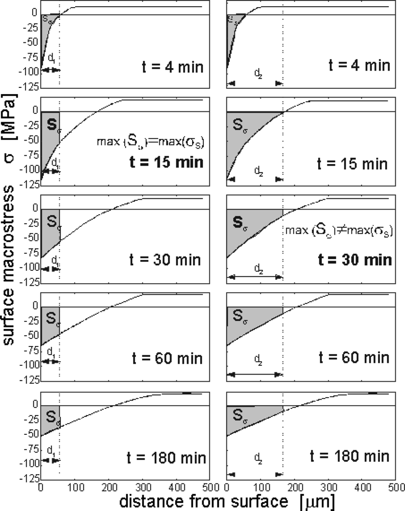 - σ(x,t) – macrostresses which are parallel to the surface, in x distance from the surface,