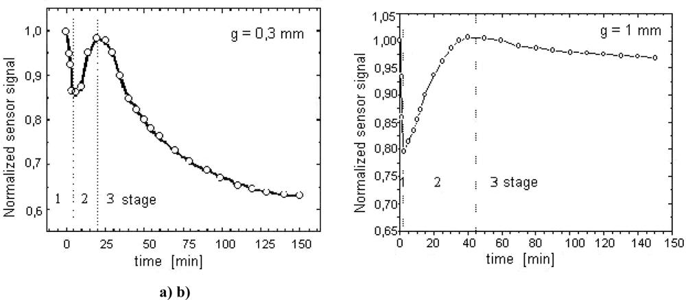 Figure 12a presents an example course of the changes of the voltage induced in the magnetic sensor registered in the nitriding process of a sample made from Armco iron and with 1 mm thickness, in an atmosphere with a nitrogen potential (KN = 0.08) located in the area of phase α on Lehrer's diagram [T = 560 °C (833 K)]. The registered characteristics U = f (t) correspond in a qualitative sense to the changes of surface macro-stresses (Figure 12b) as calculated for the above-mentioned parameters of the process. These macro-stresses represent two characteristic stages of the creation of the diffusion zone. The former is connected with an increase of the surface nitrogen concentration accompanied by an increase of compressive stresses and a decrease of the voltage signal, while in case of the latter stage there is a relaxation of stresses, which causes an increase of the voltage.