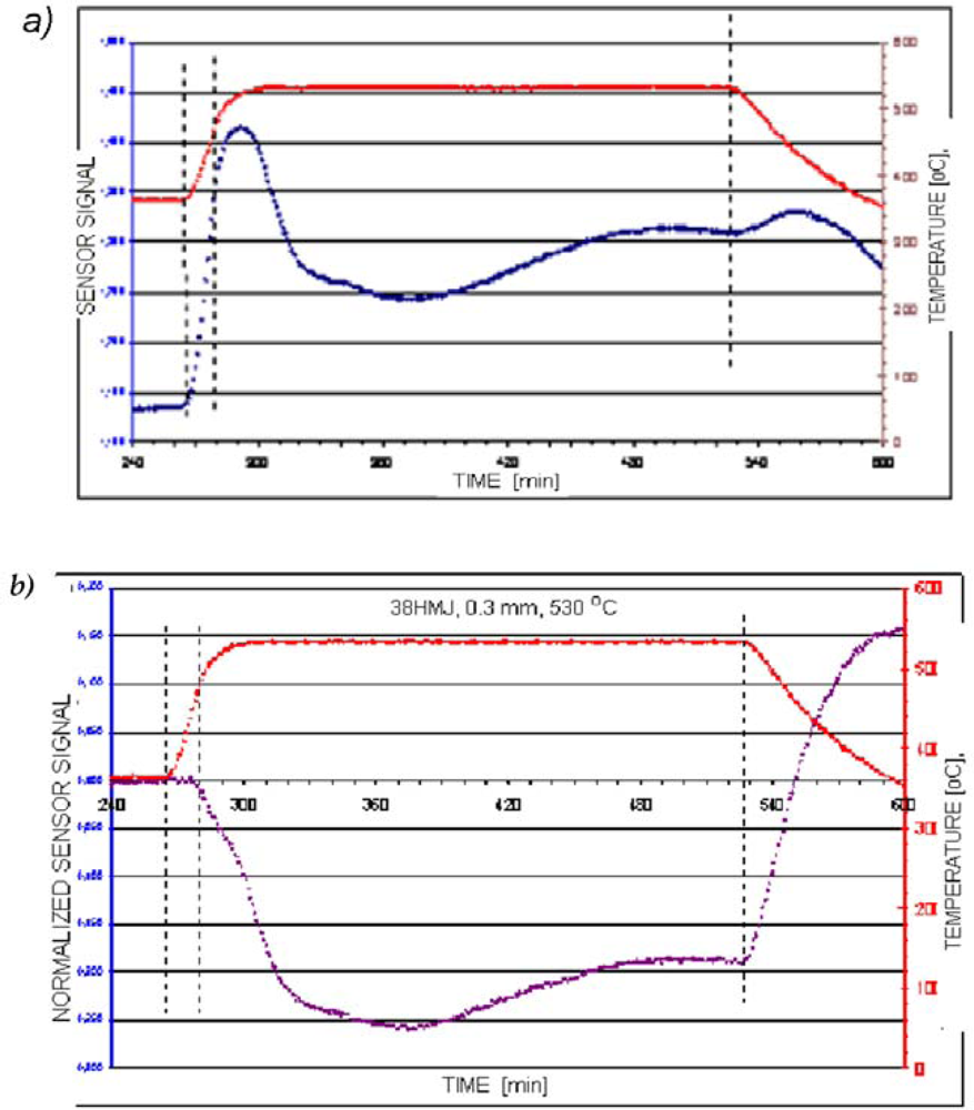 Particular attention was paid to the development of a model allowing the separation of the background temperature. It is the impact of changes in electromagnetic properties of steel samples on the sensor signal, caused by variations in temperature that occurs during the heating furnace to the temperature of the process. The background temperature is characteristic of each individual steel and must be subtracted from the sensor signal by the corresponding software of the system. It is developed based on a database containing the sensor signal values recorded during the heating of samples to the process temperature. Samples of these processes are protected from the nitriding process. A sample variation in the sensor signal with background temperature, and with no background is presented in Figures 17a,b. After subtracting of the background, during the heating furnace until the start of the formation of a layer, which initiates the beginning of the dissociation of ammonia [ca. 350 °C (623 K)], the signal recorded by the sensor does not change.