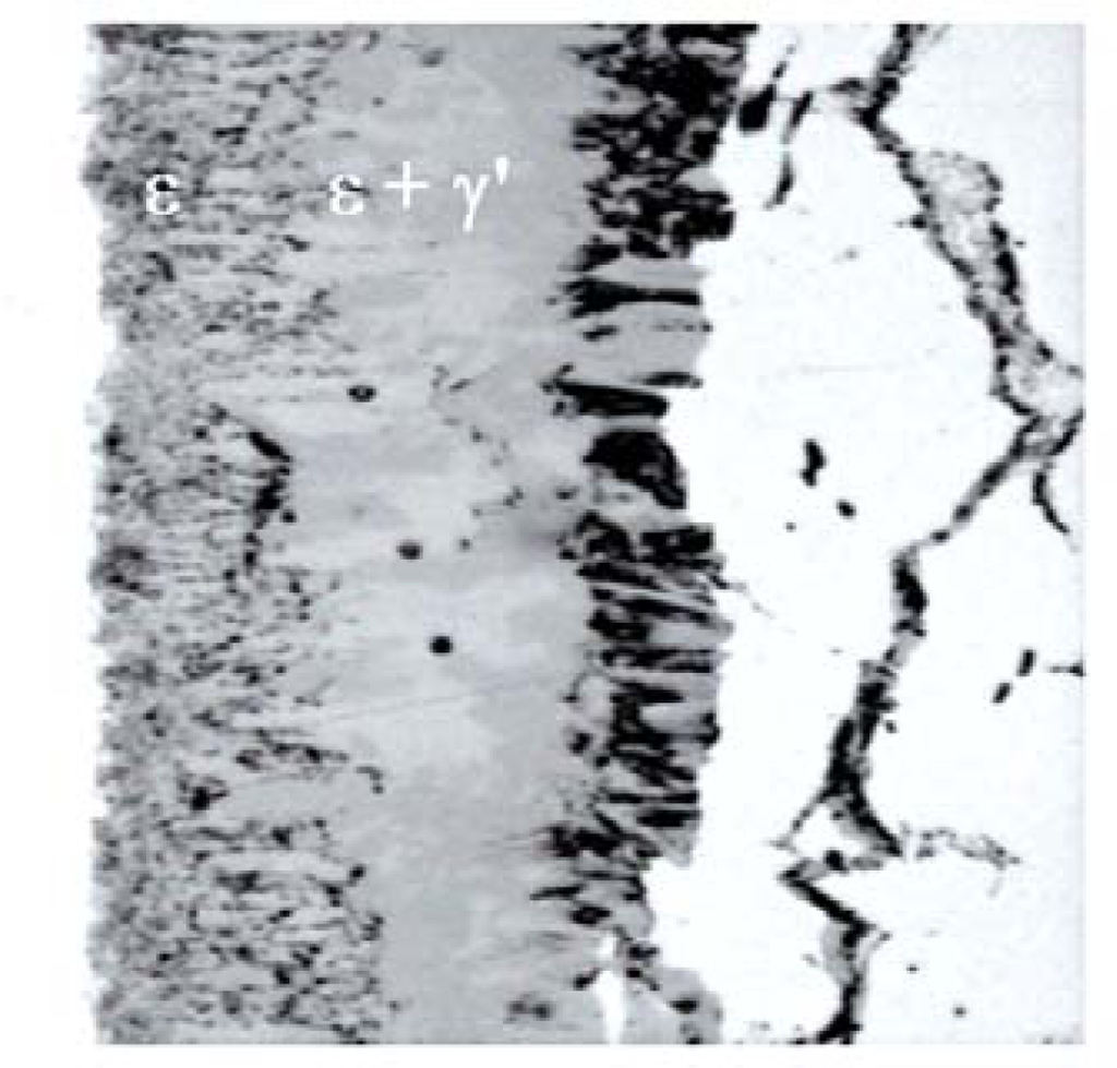 In the case of alloy and carbon steels, the sequence of phases in the compound zone evolves with nitriding time [14,15]. The subdivisions in well-defined ε and γ′ sub-zones are replaced by a mixture of phases (Figure 2). On the basis of systematic studies regarding the phase constitution of the compound zone on carbon steels, it was concluded that a direct nucleation of ε phase on the diffusion zone was explained by a small solubility of carbon (<0.2% wt.) in γ′ phase in contrast to the large solubility for carbon in ε phase [16–21].