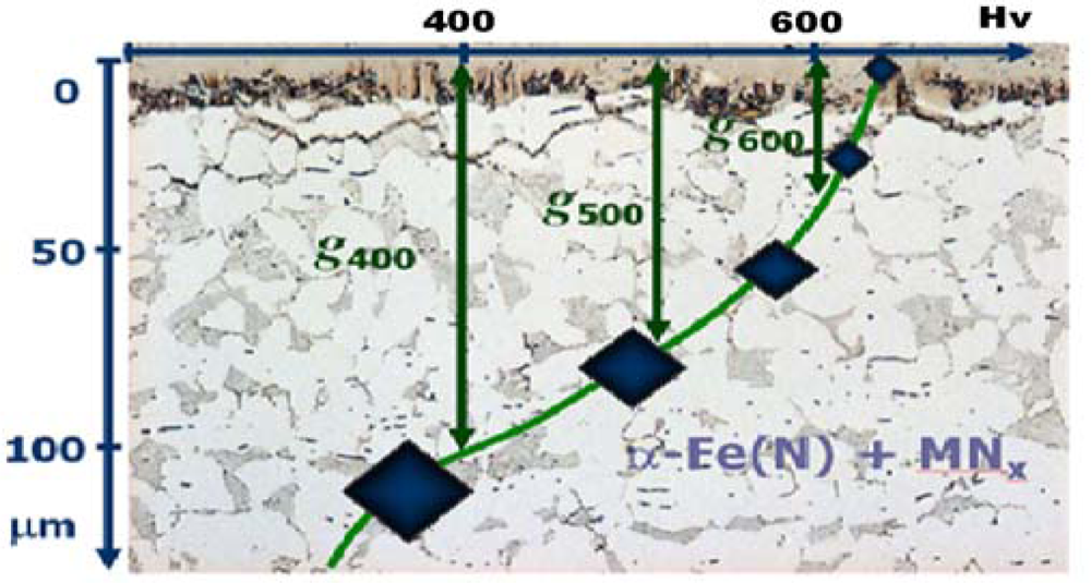 On the basis of the research presented in papers [22,23], it was demonstrated that owing to the construction and phase composition of the iron (carbo)nitrides zone being different than in the case of iron, as well as the structural changes occurring in this zone during the process, the quasi-equilibrium of nitrogen concentration is upset on the interfacial boundary of the diffusion zone/iron (carbo)nitrides zone. Moreover, it was demonstrated that the phase structure of the iron (carbo)nitrides zone has a significant contribution, regardless of the nitrogen potential and the temperature, to the creation of the diffusion zone, and its effective thicknesses g400, g500 and g600 in particular (Figure 3).
