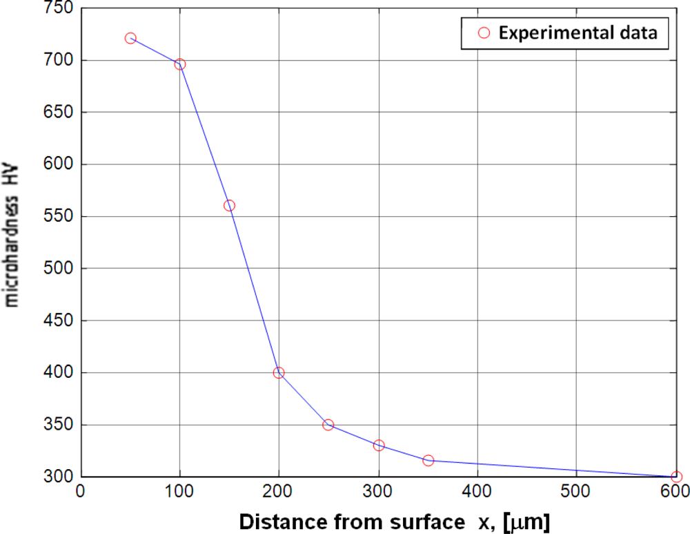 Example of microhardness profile for 18H2N2 (18CrNi8) steel (T2 = 530 °C (803 K), t2 = 480 min, KN = 6).