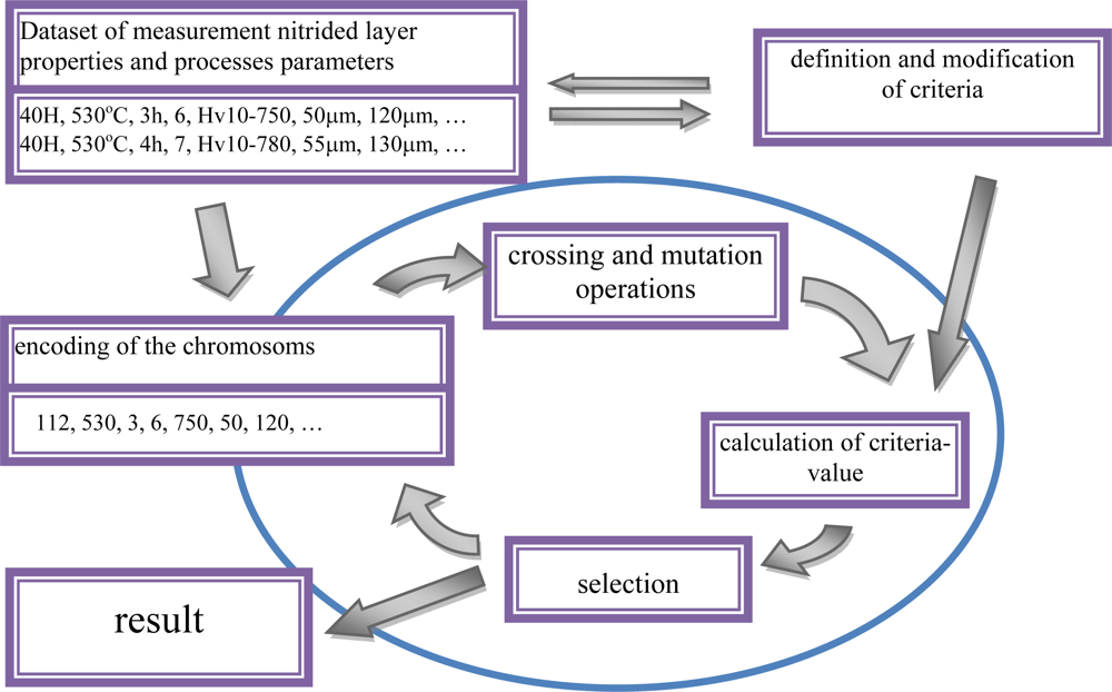 Owing to the data sets collected in the database, a statistical model could be developed, where the procedure of evolutionary algorithms was used (Figure 6). This model made it possible to forecast the process parameters for the required hardness profile in the diffusion zone. In the model under development, each chromosome includes encoded parameters of a single steel nitriding process. Chromosome sets form the so-called population. For each chromosome, a steel hardness profile is designed corresponding to it. For this purpose, a trained neural network is used, which performs the role of a model. Each chromosome (a set of parameters) is then evaluated, which consists in the determination of the matching of the corresponding hardness profile to the profile sought. On the further step, the chromosomes undergo a selection (a selection of chromosomes with the best matching), and a modification with the aid of crossing and mutation operations. Then they are promoted to another population. In this manner, by way of a directed evolution of steel nitriding parameters, such a set of chromosomes is selected for which the hardness profile matches best the profile sought.