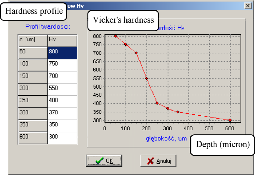 An application of computer models developed to enable obtaining quantitative information about the current characteristics of the layers, i.e., the thickness of the compound zone, surface hardness and hardness profiles are shown on the example of steel 38HMJ (41CrAlMo7) (Figure 18), because products made from the steel often undergo a process of nitriding.
