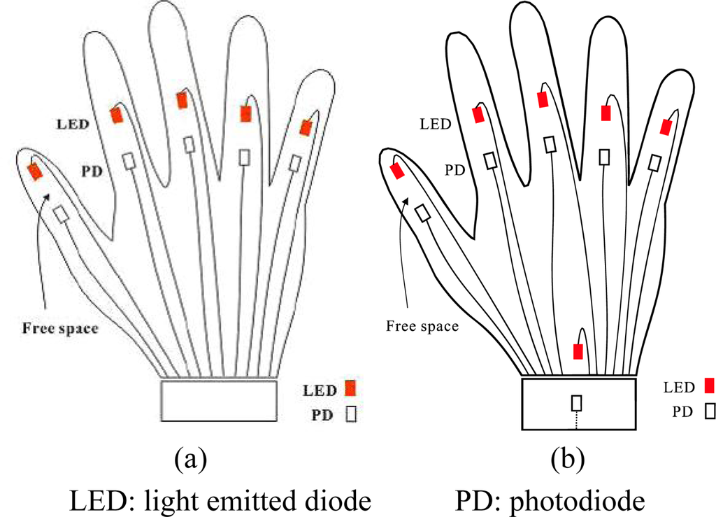 We have manufactured a data glove that uses only light-emitting diodes (LED) and photo-detectors (PD) (i.e., without optic fibers, light from LEDs will reach PDs on line of sight) in measuring the bending degrees of fingers, as illustrated in Figure 1a [10]. The developed data glove is coupled with a virtual keyboard simulated as a predetermined 15 × 6 matrix keying system, which can display the intended message on a screen. Specifically, the x and y coordinates on the virtual keyboard are decided by the movements of the index and middle finger, respectively. Once the desired letter is highlighted, the user then bends his thumb to give the confirmation signal to complete a letter selection sequence. The system described above has two drawbacks and this work proposes two corresponding solutions, as explained below.