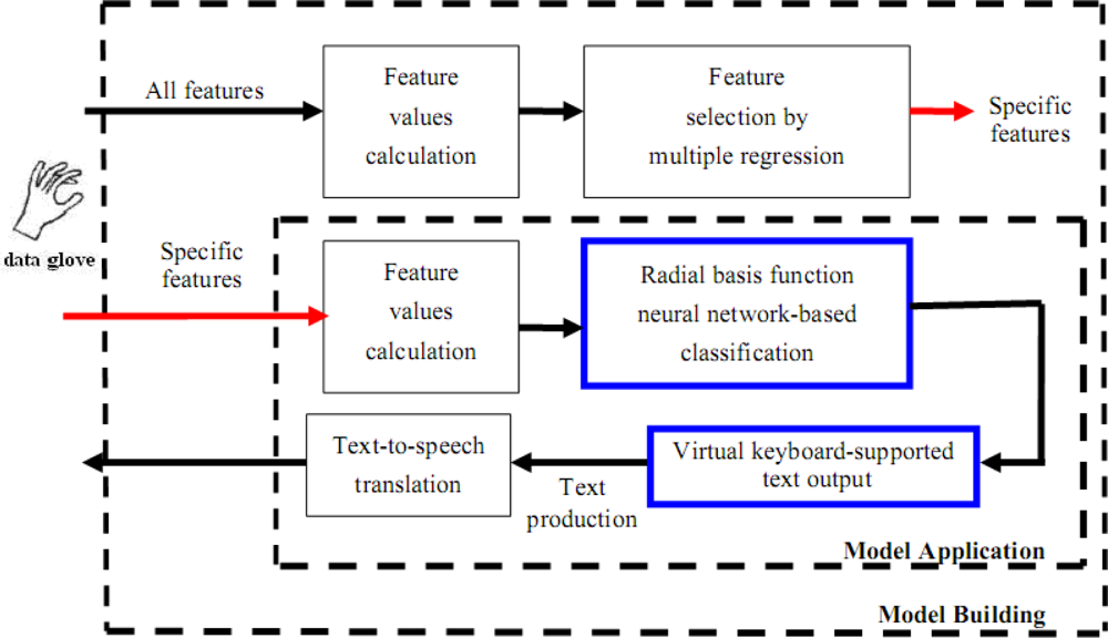Given the fact that the finger situations for handicapped aphasiacs are far more complicated and varying than those of normal people, the traditional dichotomy model distinguishing merely the bending and stretching states is inadequate. To fulfill practical needs, gray box modeling is adopted instead, in which the concept of fuzzy sets is incorporated to address the issue of meaning impreciseness, as is true of facing the ubiquitous vague or imprecise statements in real-world linguistic information. Important techniques involved in the recognition of finger language components are shown in Figure 2, including feature values calculation, feature selection and radial basis function neural network-based classification. The major purpose is that given a finger gesture, this subsystem should determine the features of the gesture and then use them to correctly classify it into one of the 11 classes, which correspond to the 11 language components as we defined in Table 1.