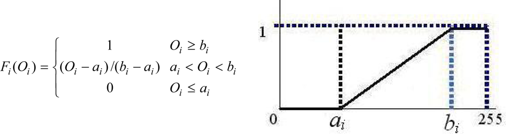 - Fi: Bending degree of each fingerEquation 1 below defines Fi to be a function of Oi to calculate the bending degree for finger i.where ai and bi denote the signal values for the least bent and the least straight situations of finger i, respectively. The function is illustrated in Figure 3. Table 2 lists the respective ai and bi values for the five fingers of User4 (Row 4, Table 3). Take F1 (bending degree function for thumb) as an example. Then, at some specific O1, we have a corresponding bending degree F1, as illustrated by Equation 2.