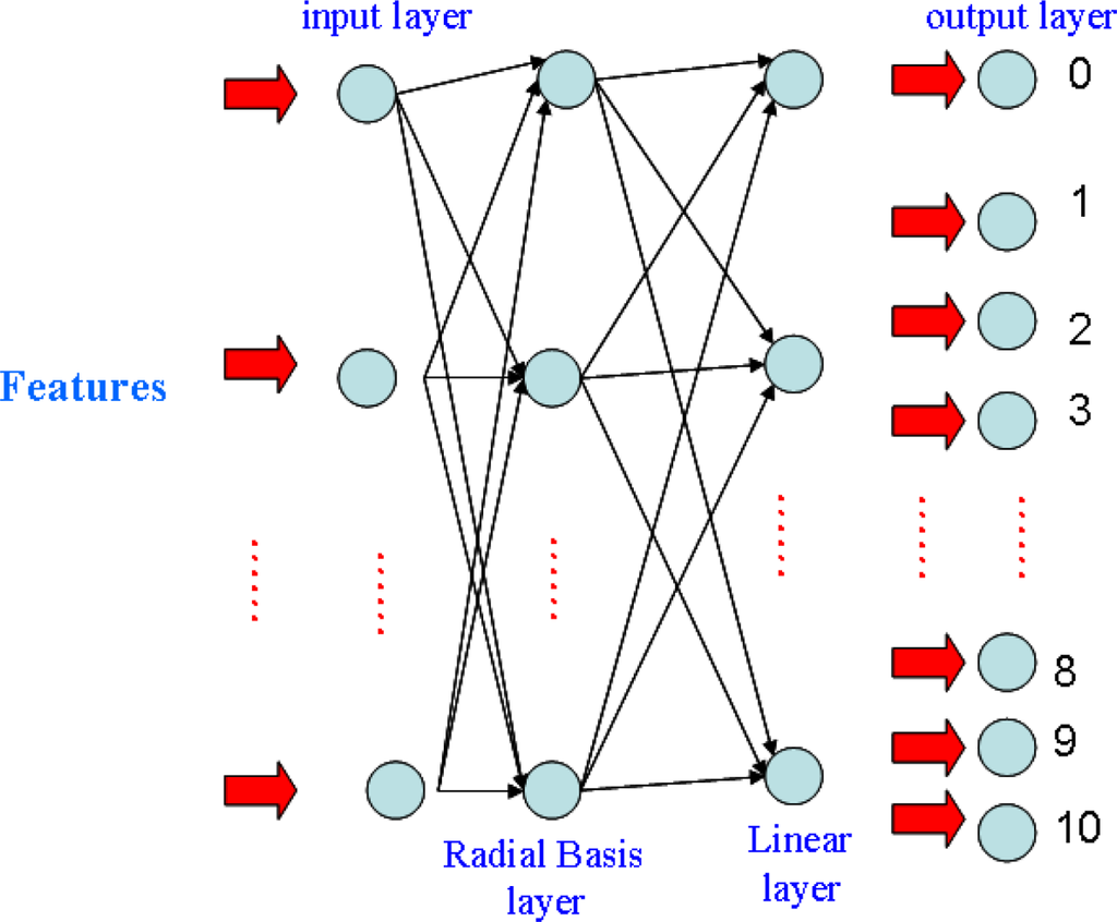 We are employing the radial basis function neural network (RBFNN) for classification. The architecture, illustrated in Figure 4, learns how to classify finger language components according to the selected input features. The selected feature values calculated in the above are first input at the input layer of the network, and after going through manipulations in the hidden layer neurons, 11 state values come out of the output layer, which correctly identify the corresponding components. Our implementation tool is MATLAB.