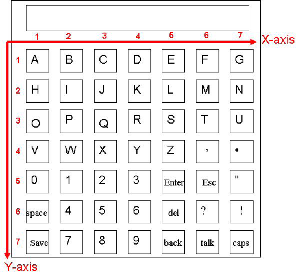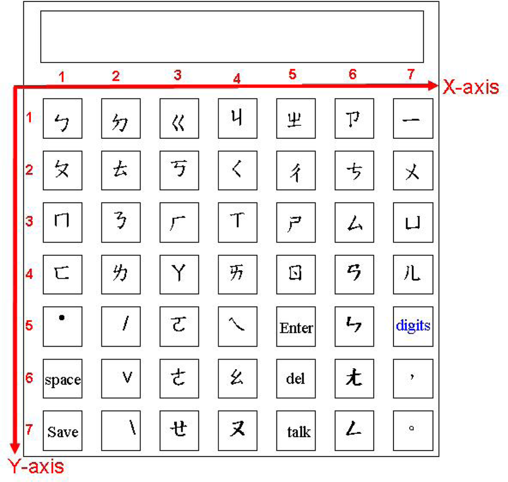 It costs the same to input any letter by designating the coordinates X and Y of the corresponding cell. The Chinese virtual keyboard is specifically developed for Taiwanese users for they use the Taiwan phonetic system to enter words. The keyboard supports the 37 phonetic symbols, the 5 tone symbols—short tone (•), tone one (space), tone two (/), tone three (v), and tone four (\), the conjugate characters, and the numeric characters. Characters like space, backspace, and carriage return are also supported. When a user inputs a phonetic symbol, e.g.,