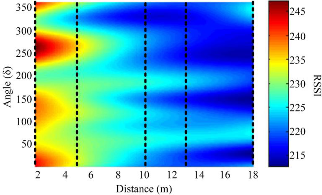 In real-world scenarios, it is impossible to construct a reference standard pattern for a reference node under all of the possible distances and orientations of the external antenna. We measured the values of RSSI when a sensor node is moved away from the reference node by five individual distances (1.8 m, 5 m, 10 m, 13 m, and 18 m).