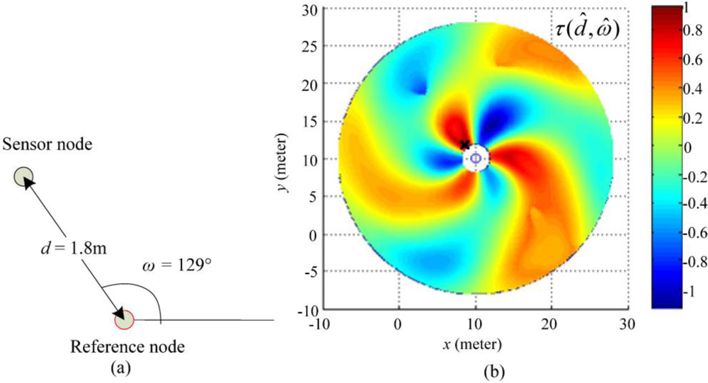 First, we used the proposed algorithm to localize a sensor node in a single reference node scenario. The deployment arrangement is depicted in Figure 13(a), where the coordinate of the reference node is (10, 10), the sensor node and the reference node are separated by 1.8 m, and the azimuth of s to r is 129°. The robust correlation τ(d̂, ω̂) estimated from the measured RSSI pattern is shown in Figure 13(b). In this test case, the maximum correlation is presented at τ(1.9 m, 128°), which implies that the estimated coordinate of the sensor node is (–1.1957, 1.4766). By comparing the estimation result with the true position of the sensor node, the estimation bias is 0.1051 m.