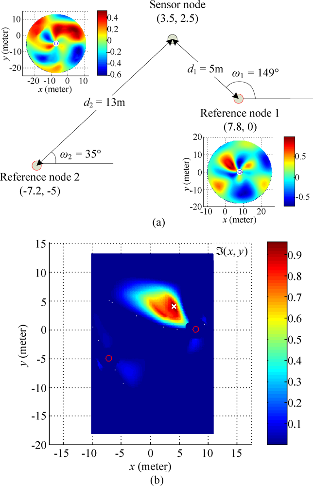 In the two-reference nodes scenario, two reference nodes are deployed at individual coordinates (7.8, 0) and (−7.2, −5). The true position of the sensor node is at (3.5, 2.5). The deployment arrangement is depicted in Figure 14(a). By using the collaborative localization scheme previously introduced in Section 4, an overall solution space ℑ(x, y) can be constructed as shown in Figure 14(b). The centroid coordinate of ℑ(x, y), which can be used to indicate the potential location of the sensor node, is located at (3.8, 3.6). By comparing the estimation result with the true position of the sensor node, the estimation bias is 1.14 m. The estimation bias in the two-reference nodes scenario is larger than that in single reference node scenario because the distances between sensor node and reference nodes in the previous scenario are significantly larger than that in the latter one.