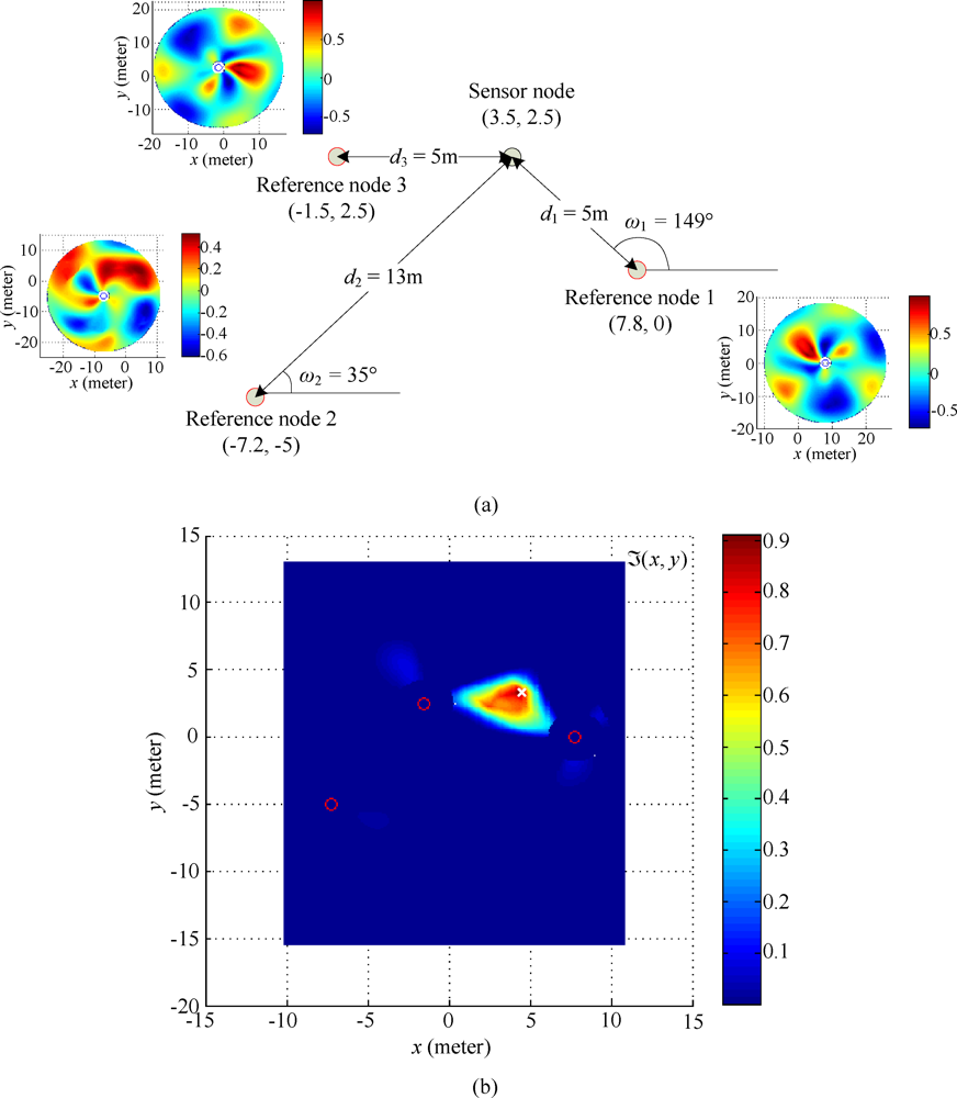 If we want to improve the localization accuracy obtained in two-reference nodes scenario, another reference node may be added at the coordinate (–1.5, 2.5). This leads a three-reference nodes scenario, as shown in Figure 15(a). The robust correlations τ(d̂, ω̂) estimated from individual reference nodes are merged into an overall solution space ℑ(x, y) as illustrated in Figure 15(b). The estimation result shows that the coordinate of the sensor node is (3.3, 2.5). Comparing the estimation results with the true position of the sensor node, the estimation bias when using the three-reference nodes scenario is significantly reduced to 0.2 m. These findings suggest that more reference nodes deployed in the network can improve the estimation accuracy when the proposed localization algorithm is employed.