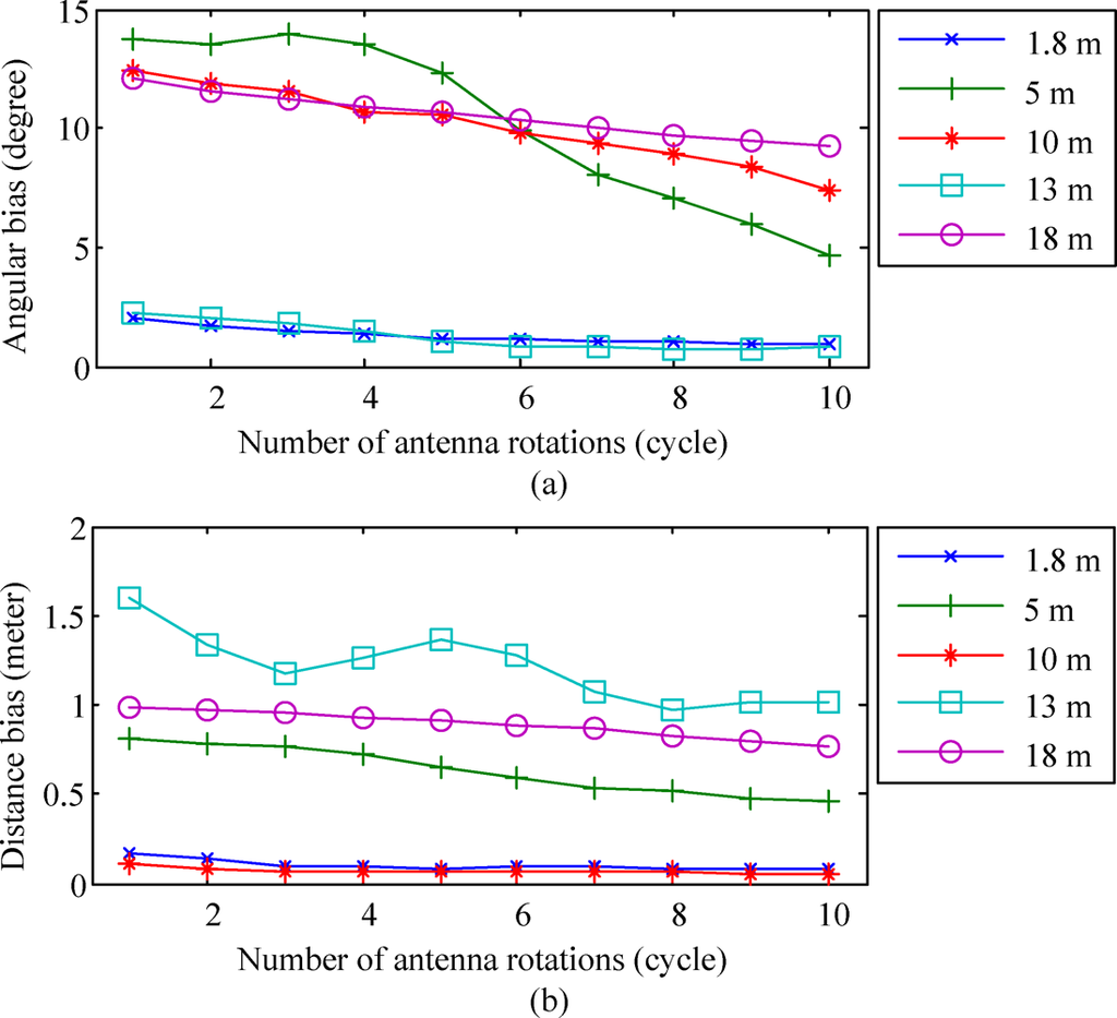 (a) Average angular biases and (b) averaged distance errors yielded by the proposed algorithm versus different number of antenna rotations (cycle).