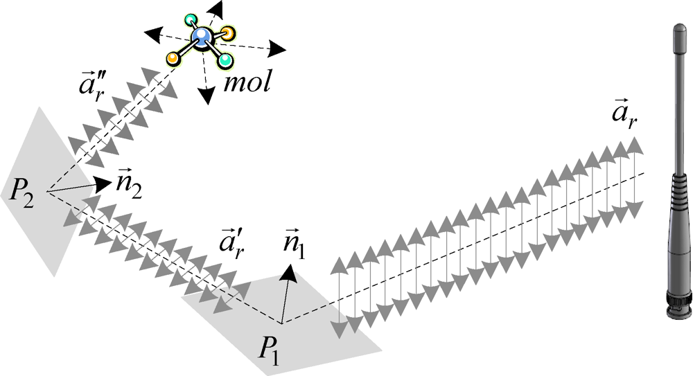 According to the descriptions given above, we suppose that any existing interface in the natural environment functions as an action on the polarization vector (a⃗r) of the EM wave. Assuming that there are Np interfaces (Pi’s) given by: