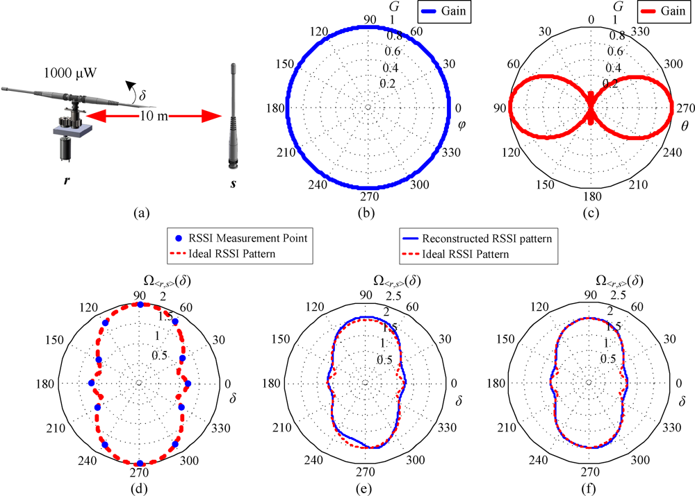 An example of RSSI measurement. (a) A pseudo scenario that consists of a sensor node s and a reference node r, where the sensor node is located at the eastern side of the reference node and the angle of rotation of the antenna of the reference node is denoted by δ; (b) The H-plane EM wave pattern of the omnidirectional antenna utilized in this study; (c) The E-plane EM wave pattern of the omnidirectional antenna utilized in this study; (d) An ideal RSSI pattern and RSSI measurement points that are derived from Equation (2); (e) A reconstructed RSSI pattern after the antenna of the reference node completes the first cycle of rotation; (f) A stabilized RSSI pattern that is estimated by repeated RSSI measurements.