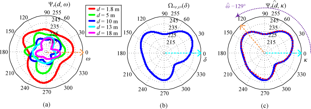 where σ(▿Ψr(d, κ)) and σ(▿Ω<r, s>(κ)) are variances of ▿Ψr(d, κ) and ▿Ω<r, s>(κ), respectively. The amplitude of τ(d̂, ω̂) measures the strength of similarity between ψr(d̂, κ) and Ω<r, s>(κ + ω̂). For instance, r and s are likely distanced d̂ meters apart when τ(d̂, ω̂) = 1, and the angular direction of s relative to r is ω̂, counterclockwise. In addition, τ(d̂, ω̂) = 0 means that there is no relation between these two-paired RSSI patterns. As shown in Figure 5(c), by matching Ω<r, s>(δ) with Ψr(d, ω), we can obtain a large value of τ(d̂, ω̂) which is equal to 0.97 if d̂= 1.8 and ω̂= 129° are given.