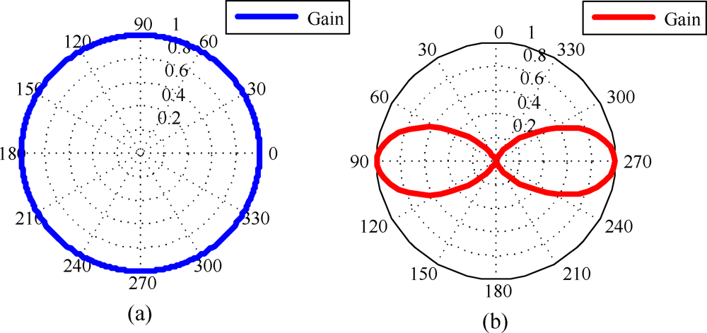 The radiation pattern of the antenna of s and r (a) The H-plane radiation pattern of the omnidirectional antenna utilized in the simulation. (b) The E-plane radiation pattern of the omnidirectional antenna utilized in the simulation.