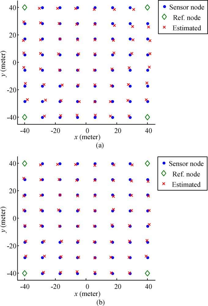 where (x̂s, ŷs) is the estimated coordinate of the sensor node s. Since the squared-centroid method is linear computational complexity (x + y), it is more preferred than a traditional centroid method with an order of (x × y) time complexity. With more reference nodes involved in the localization process, we can further improve the accuracy of coordinate estimation presented above.